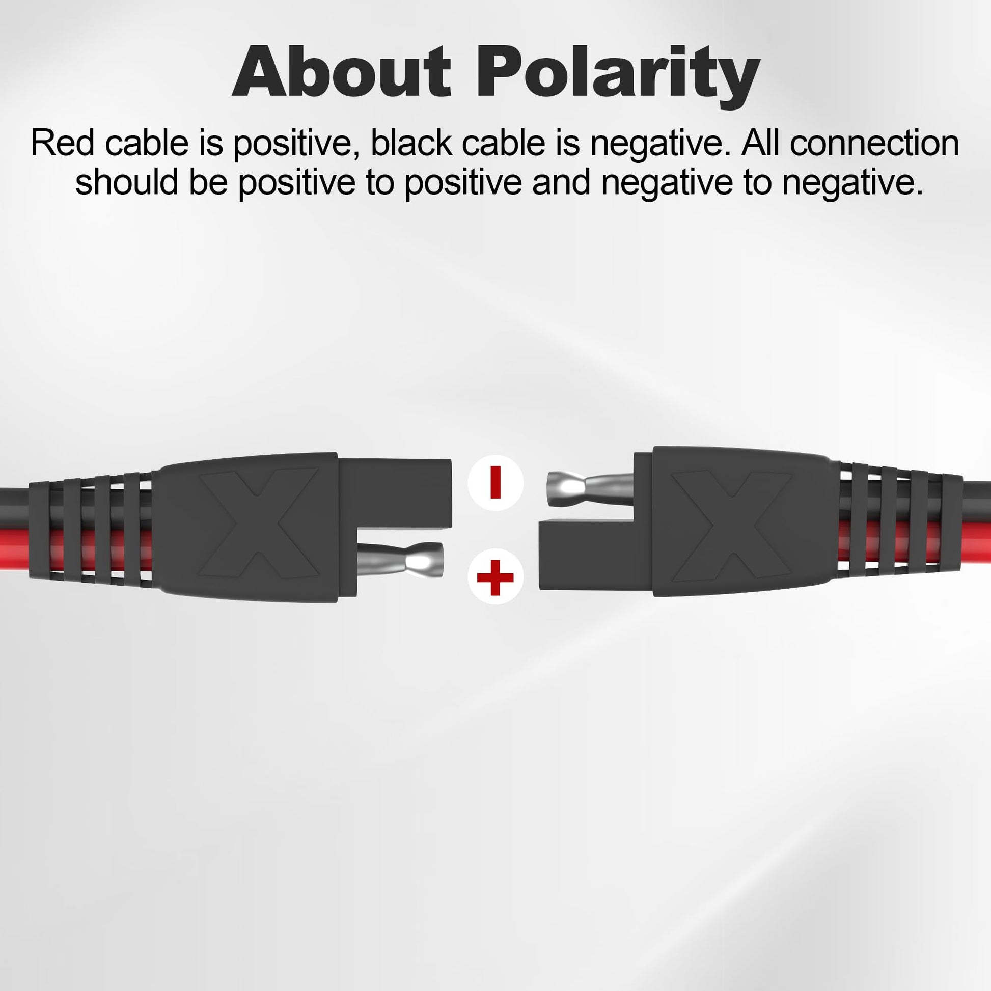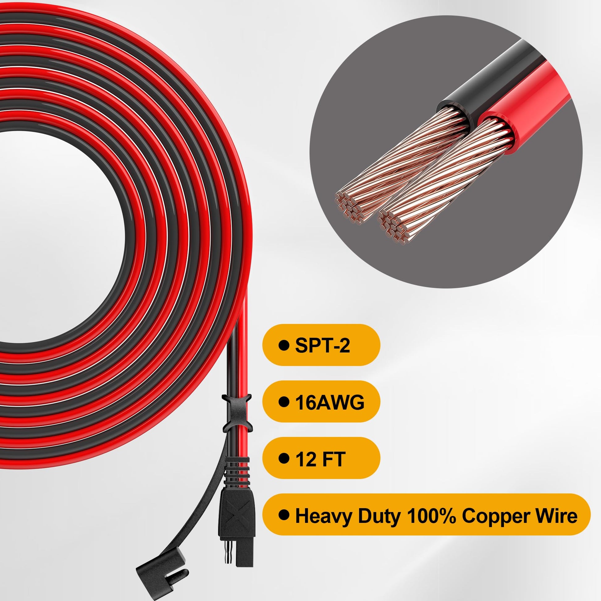 - [ Premium Material ] The SAE cable is made of 12FT copper wire, covered with high-quality insulation PVC jacket, with a specification of 16AWG, 2-pin, red wire for positive and black wire for negative. The wire harness is lightweight, flexible, durable, and suitable for solar panel chargers.