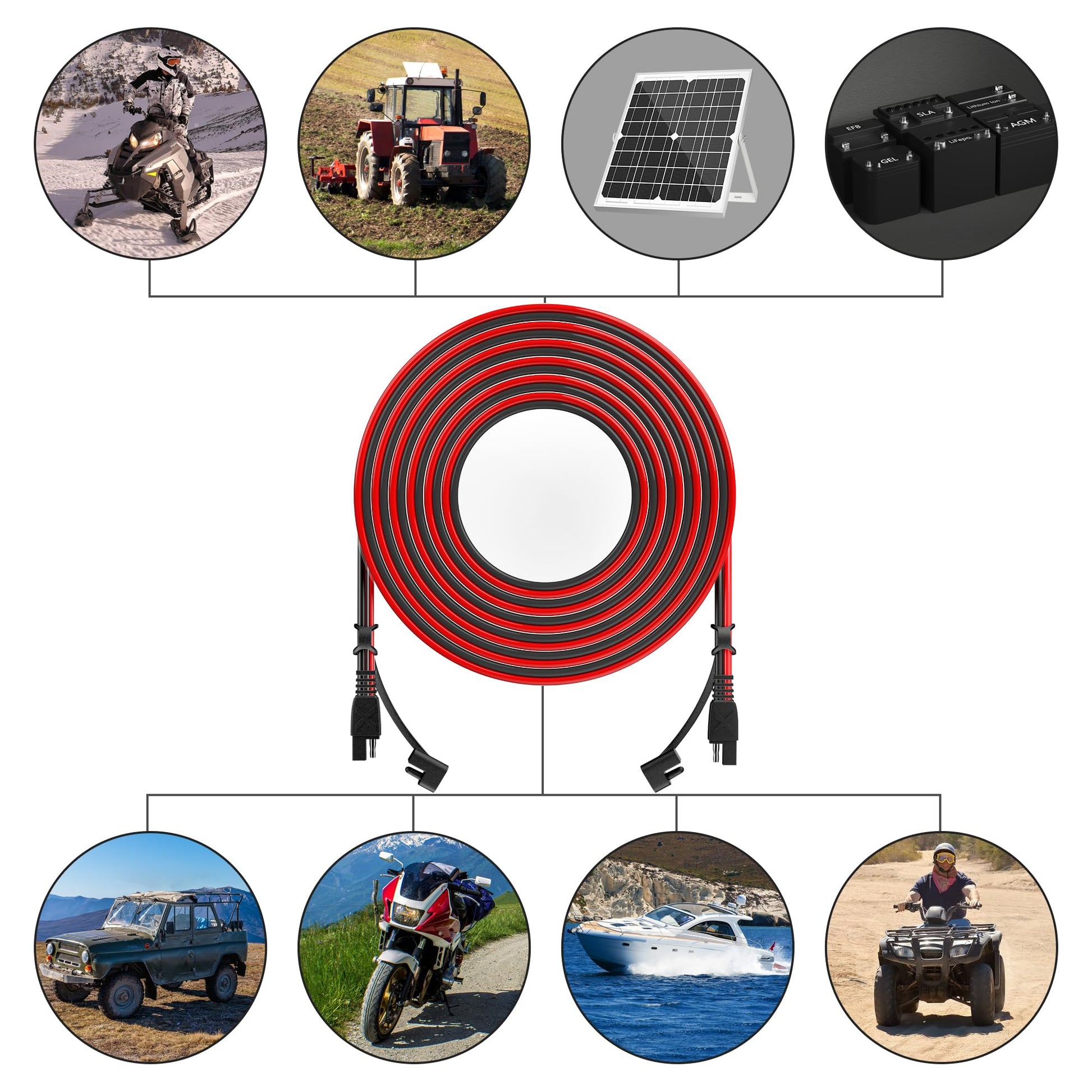 - [ Wide Compatibility ] The SAE connector is compatible with most batteries and chargers on the market. The standard port is used for quick output and disconnect. Compatible with standard SAE connectors. Used for various solar panels, cars, motorcycles, tractors, trucks, ATVs, RVs, etc.