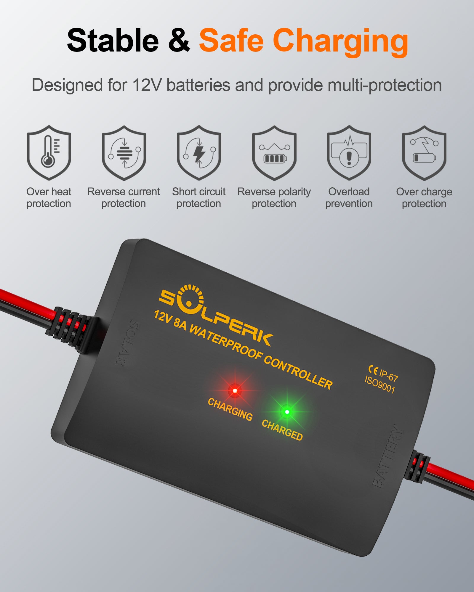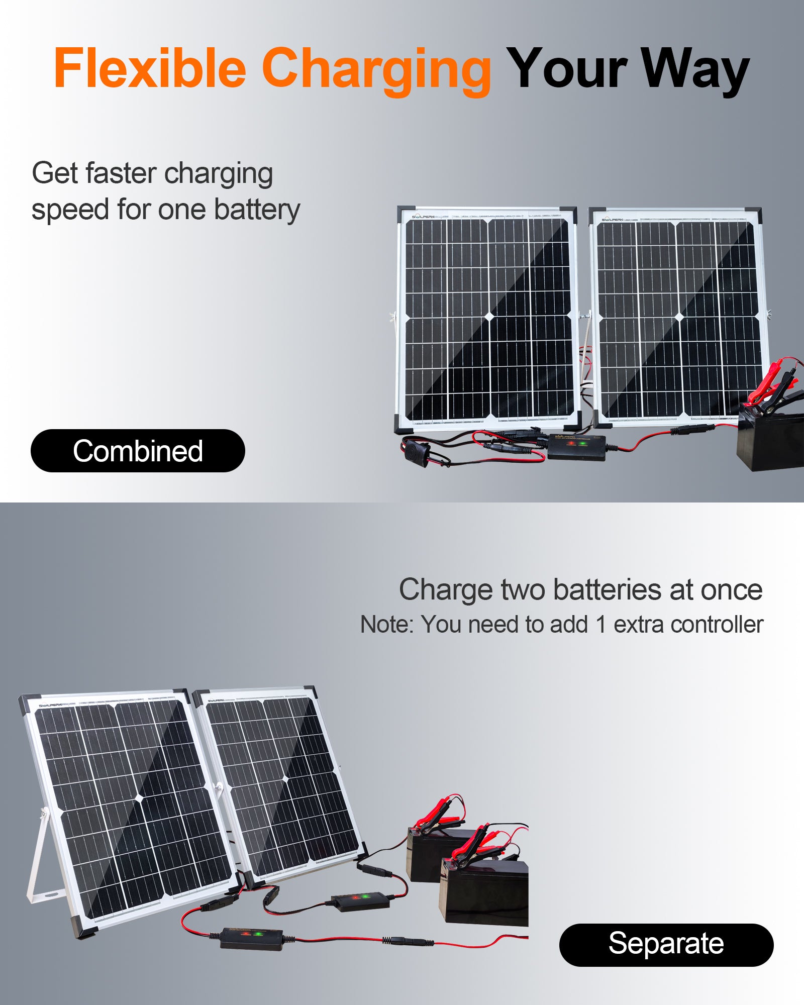 - Versatile Charging Saves Costs: The special solar trickle charger system makes green energy simple and flexible. Consisting of two 25W solar panels, you can easily combine or disassemble them, and with only one additional controller, you can charge two batteries at the same time to adapt to different charging needs, helping you to save costs and increase the efficiency of use