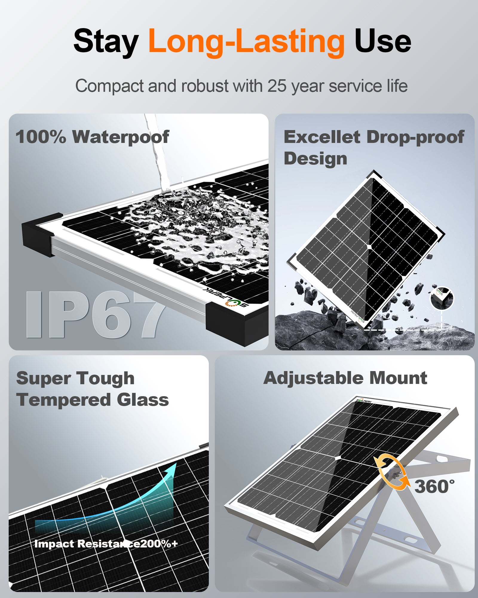 - Higher Efficiency & Durable: This solar panel charger is powered by high-efficiency monocrystalline silicon cells with a conversion rate of up to 30%, allowing you to charge faster. The corrosion-resistant aluminium frame and toughened glass coating ensure resistance to weathering and wear and tear, and the IP67 waterproof certification means it stands up to all weather conditions. Built to last with a 25-year lifespan, allowing you to enjoy reliable and stable green energy for a long time