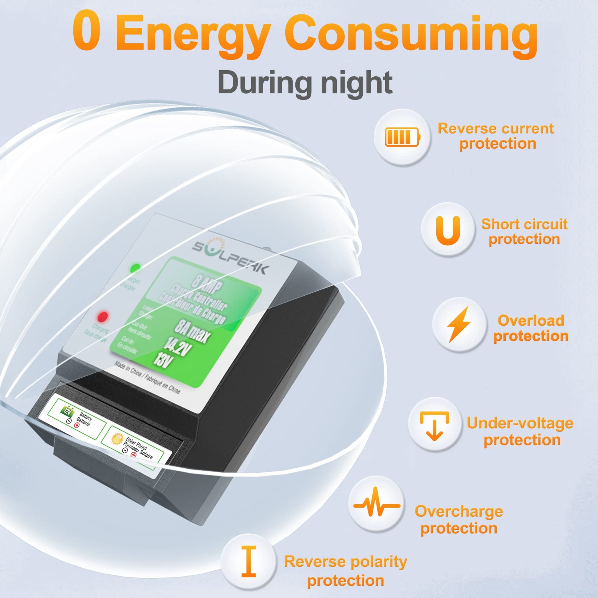 - 【SAFETY USE】12v Solar charge controller protects the battery from damage caused by overcurrent, short circuit, reverse polarity connection, low voltage, overcharge. This 8A solar charge controller will extend the service life of your battery.