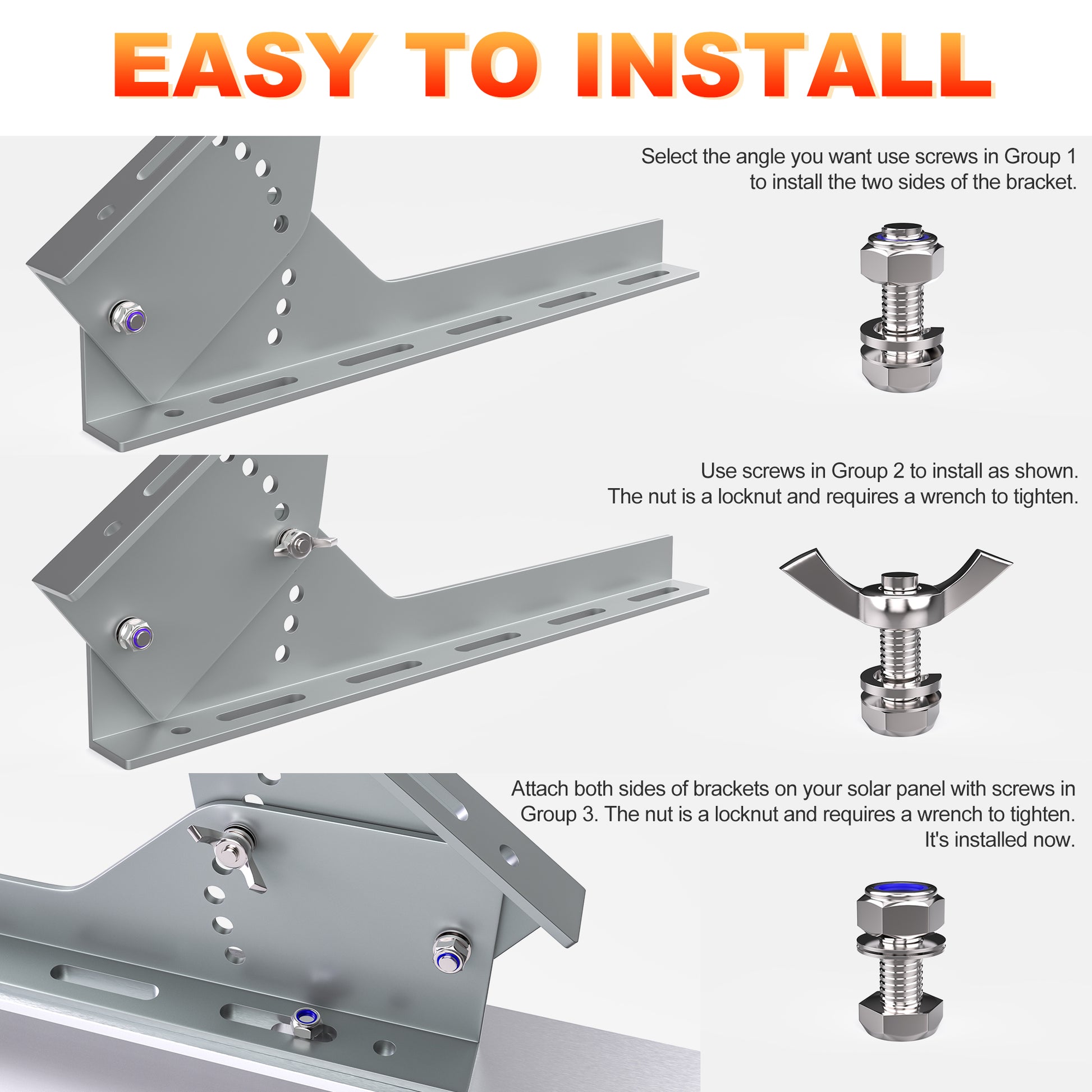 - [What You Get] - 1 × solar panel stand, 1 × mounting screws set. 12 Month-Warranty and our 7*24h Technical Service Support. If you have any questions, please feel free to contact us. We will try our best to make you 100% satisfied with your purchase.